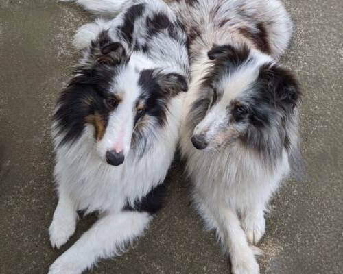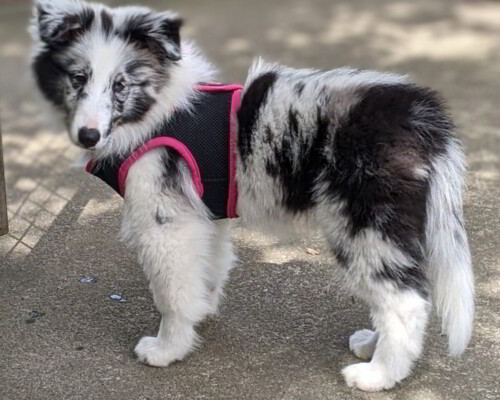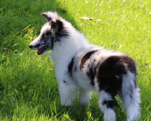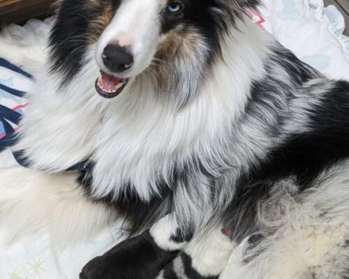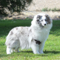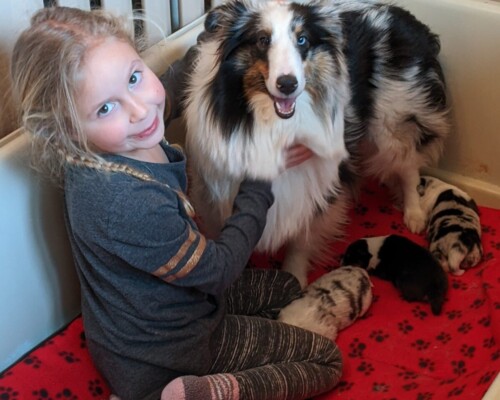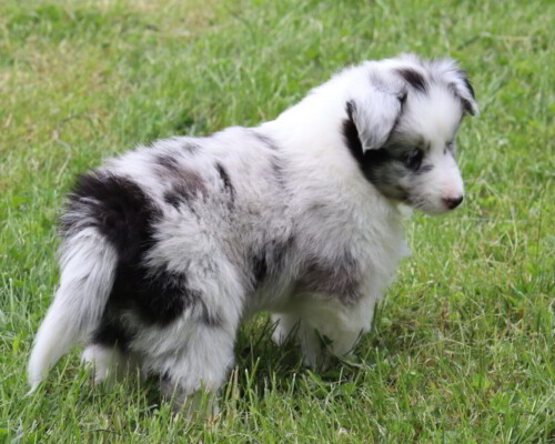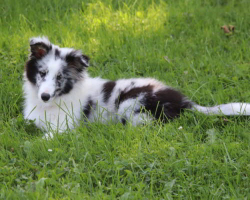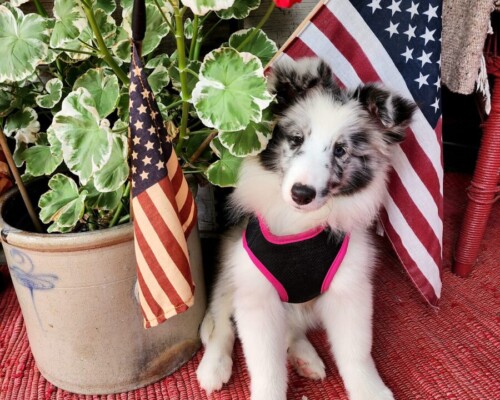 Izzy is Connor and Orchid’s bi-blue merle 2023 daughter. She is as enthusiastic as her Mom and as sweet as her Dad. We are pleased to anticipate lovely puppies in the future with her.