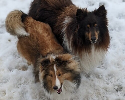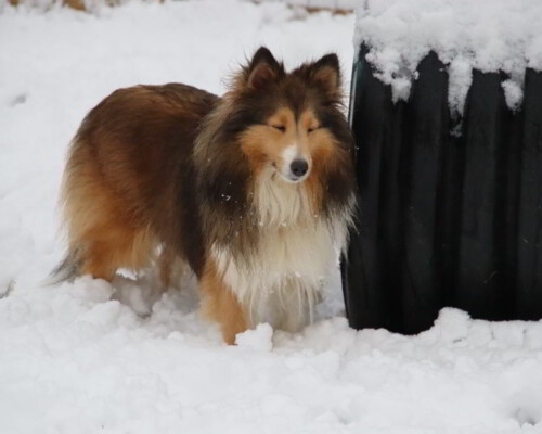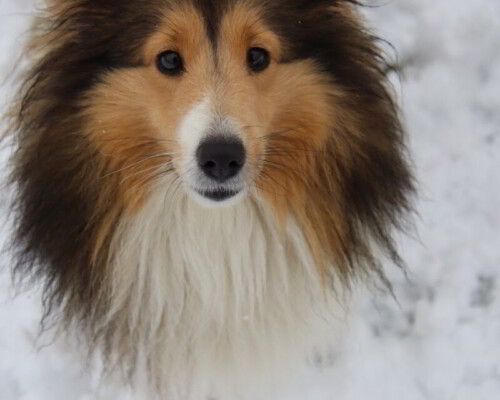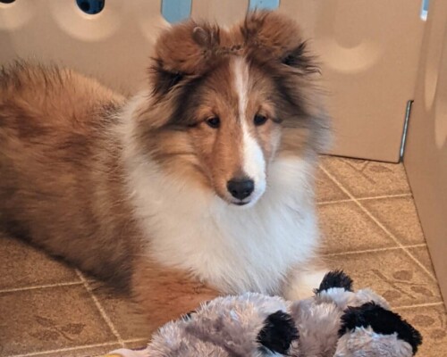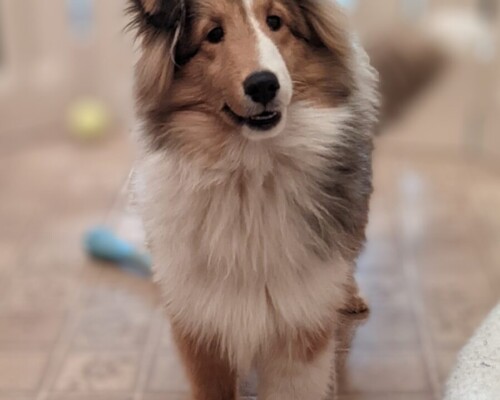 Trudy is a gentle and sweet ‘pure for sable’ girl. She comes to us from Belmark Shelties and is truly a beautiful sheltie. I love how excited she is to see me and her happy happy wiggle. She was bred to Vinny and they produced a litter of six in March 2024. We shall see what the future hold for these two.